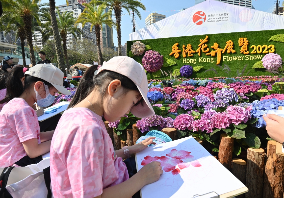 (右起)康樂及文化事務署署長劉明光、香港賽馬會慈善及社區事務執行總監梁卓偉、立法會主席梁君彥、文化體育及旅遊局局長楊潤雄、2022香港小姐冠軍林鈺洧,以及舞者在開幕典禮合照 今屆花展以“繡麗綻放、幸福滿載”為主題,會場中軸線以春、夏、秋、冬為創作主題的花圃組成,近興發街入口的花壇洋溢着春天氣息,色彩繽紛的繡球花為城市換上時尚春裝,蝴蝶、蜜蜂起舞唱歌,遊人可感受到散發至每個角落的歡樂氣氛。夏天花壇則以夏日蔚藍的天空、碧綠的海洋和恬靜的沙灘為背景,造型可愛的海馬、鯨魚、八爪魚和海龜等樂在其中。秋日的庭園有斑斕的鮮花、飽滿成熟的南瓜等,交織成童話般的美景。冬日花壇近糖街入口,遊人可以穿過繡球花隧道,進入聖誕小鎮,在愉快的冬日氣氛中,感受“幸福滿載”的溫暖。 同日舉行的賽馬會學童繪畫比賽吸引了約1,600名學生參與,他們聚精會神地繪畫眼中的花展。不少市民亦紛紛在大型鑲嵌花壇、繡球花立體花牆和花圃、鬱金香和毛地黃花海拍照留念,氣氛熱鬧。
