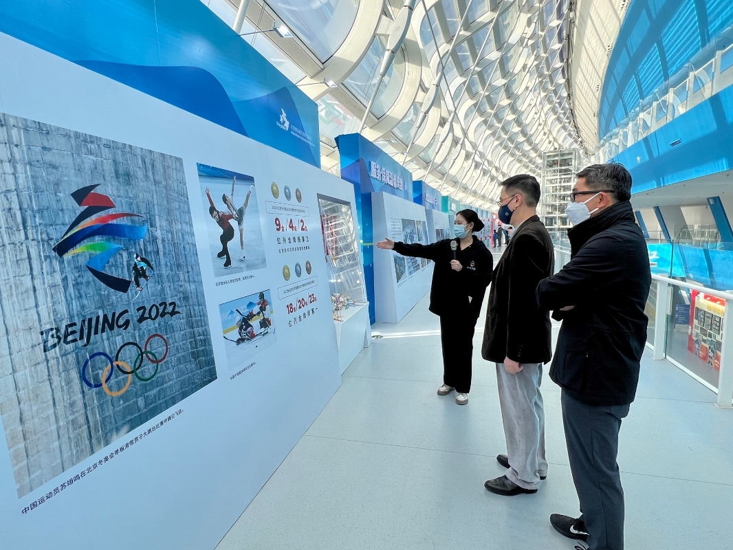 楊潤雄(中)在鄭青雲(右)陪同下參觀北京國家速滑館展覽