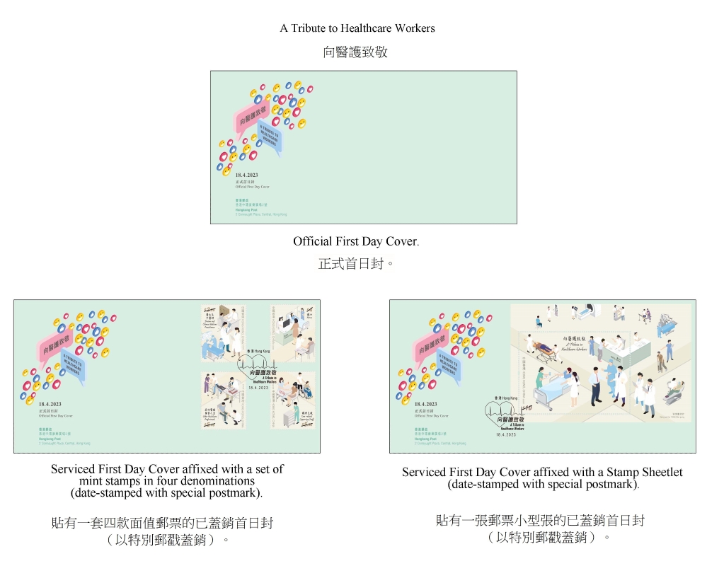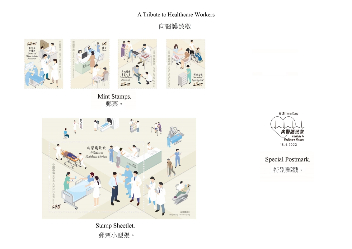 香港郵政4月18日發行以“向醫護致敬”為題的特別郵票及相關集郵品。圖為郵票、郵票小型張和特別郵戳。 香港享有高質素的醫療服務,實有賴一眾醫護人員一直緊守崗位。尤其自2019冠狀病毒病疫情爆發以來,前線及後勤醫護人員在防控疫情和治理病患方面皆全力以赴。為感謝醫護人員竭誠盡心為大眾服務,香港郵政以“向醫護致敬”為題發行一套四枚郵票、一款郵票小型張及相關集郵品,向醫護人員致以崇高的敬意。
