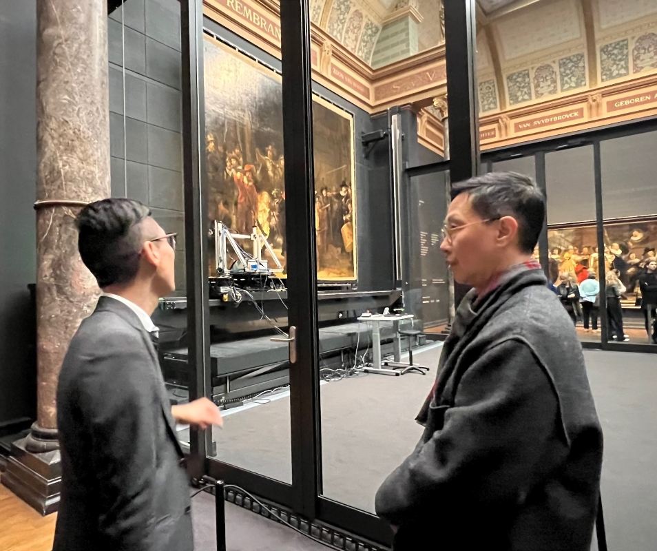 楊潤雄(右)到訪荷蘭國立博物館,觀看藝術作品修復工作。
