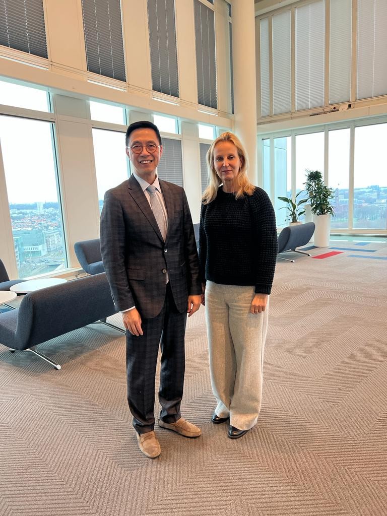 楊潤雄(左)在海牙拜會了荷蘭教育、文化和科學部局長(文化和傳媒)Barbera Wolfensbergerr。 楊潤雄於阿姆斯特丹時間3月29日在海牙分別拜會了荷蘭衞生、福利和體育部長(長期護理和體育)Conny Helder,以及荷蘭教育、文化和科學部局長(文化和傳媒)Barbera Wolfensberger,探討加強雙方在文化和體育的交流。楊潤雄向荷蘭官員介紹香港復常後的情況,在文化和體育方面的最新發展,以及透過國家《十四五規劃綱要》中將香港定位為中外文化藝術交流中心所帶來的機遇。