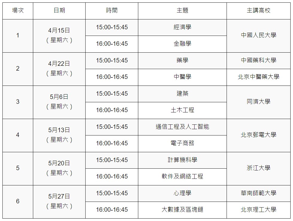 香港新聞網4月14日電 為讓有意到內地高校升學的澳門學生及早掌握最新的升學資訊,使其在規劃升學時能做好充分的準備,澳門特區政府教育及青年發展局於4月至5月期間舉辦12場內地升學講解會,邀請內地高校代表透過線上直播形式分別介紹12個不同專業的學科內容、課程特色及發展前景,歡迎有興趣的高中學生、老師及家長於澳門大專學生部落Facebook專頁或騰訊會議收看。 著名高校教授介紹不同專業情況 來自江蘇、浙江、廣東、北京及上海等地區的高校代表將於4月15日至5月27日期間,透過澳門大專學生部落Facebook專頁(www.facebook.com/studentblog.dsedj.gov.mo)及騰訊會議分別介紹計算機科學、軟件及網絡工程、通信工程及人工智能、大數據及區塊鏈、經濟學、金融學、藥學、中醫學、建築、土木工程、電子商務及心理學等專業學科的特色與優勢、發展前景等,並會即時在線上解答提問。有興趣的人士可由即日起瀏覽教青局網頁portal.dsedj.gov.mo/webdsejspace/internet/Inter_main_page.jsp?id=95686&。如有查詢,可致電教青局,電話:+853 8396 9344。 相關講解會安排如下︰