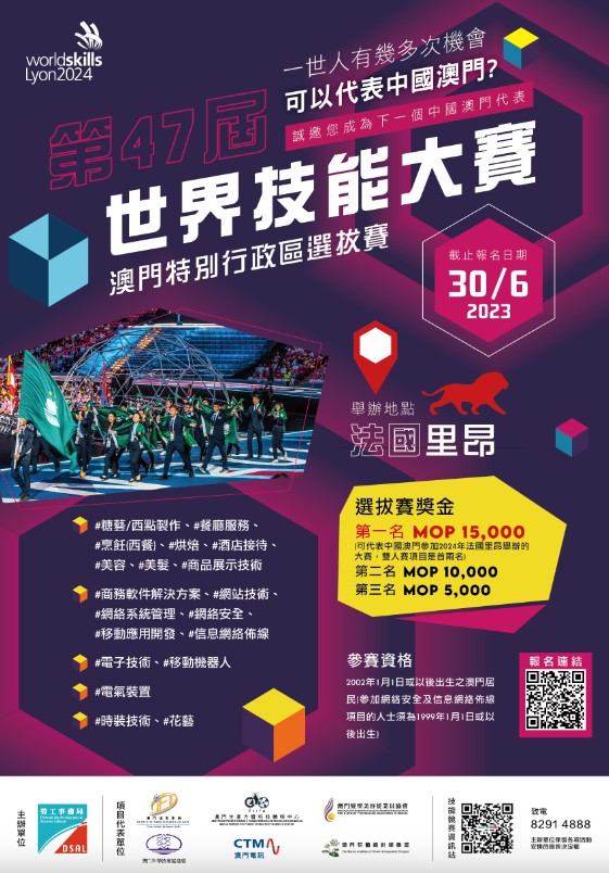 2019年世賽澳門代表選手開幕式出場。 參賽項目共19個 勞工局將組織澳門青年選手參與第47屆世界技能大賽當中的19個競賽項目,分別為:糖藝/西點製作、餐廳服務、烹飪(西餐)、烘焙、酒店接待、美容、美髮、商品展示技術、商務軟件解決方案、網站技術、網絡系統管理、網絡安全、移動應用開發、信息網絡佈線、電子技術、移動機器人、電氣裝置、時裝技術、花藝。 選拔賽分為入圍賽及決賽,通過入圍賽之參賽者,必須完成針對競賽內容而設計之強化課程,繼而進入各項目決賽,成績最優之參賽者(網絡安全及移動機器人項目為第一名及第二名以隊制名義)將代表中國澳門參與“第47屆世界技能大賽”,同時於澳門區選拔賽決賽勝出的首三名參賽者,將分別獲得15,000澳門元、10,000澳門元及5,000澳門元之獎金及獎狀。 最高級別的國際性技能競賽 世界技能大賽是最高級別的國際性職業技能賽事,雲集世界各地優秀的青年選手,共同展示當前最先進的職業技能。同時,為各地青年選手提供互相切磋、觀摩與交流職業技能的平台。本澳自1985年開始組織選手參賽,歷屆取得1金、3銀、3銅及39項卓越表現奬。 參與競賽是寶貴的學習及交流機會,以賽促學,在參賽的過程中,可激發青年主動學習,掌握業內最先進的職業技能,拓寛視野,為青年樹立不斷學習及進步的理念,助力青年走技能成才之路。 如欲了解更多有關世界技能大賽的詳情,請登入或於辦公時間致電本局職業培訓中心查詢,電話:(853)8291 4888。 (完) 【編輯:黃璇】