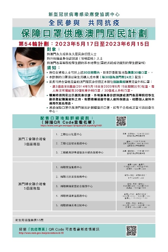一、第54輪計劃時間 為期30日,即5月17日至6月15日。 二、配售對象 本澳永久及非永久居民; 持外地僱員身份認別證(俗稱藍咭)人士; 持澳門各高等院校學生證的非本地學生。 三、配售地點 衛生局55間協議藥房; 澳門婦女聯合總會5個服務點; 澳門工會聯合總會3個服務點。 四、配售數量及售價 每人可一次性購買30個口罩,合共24澳門元。 五、兒童外科口罩配售安排 滿3週歲至8週歲(2014年5月18日至2020年6月15日期間出生)的兒童; 由55間協議藥房配售; 購買時須憑合資格兒童的澳門居民身份證正本前往協議藥房配售點購買,工作人員根據提供身份證所顯示的出生日期,確定是否合資格購買。 每人每次可選擇購買30個兒童外科口罩或30個成人外科口罩; 六、注意事項 所有合資格人士購買口罩時須出示澳門居民身份證、藍咭或澳門各高等院校學生證正本,非本地學生須經系統成功識別學生證資料後方能購買; 透過口罩計劃購買的口罩,如有不合格或次貨可退回衛生中心。 應變協調中心強調,特區政府保證口罩供應充足,居民在計劃期間的任何時間都可購買到口罩,呼籲居民毋需急於首兩日前往購買,以避免人群聚集,屆時亦無需長時間輪候,希望居民配合。 (完) 【編輯:黃璇】