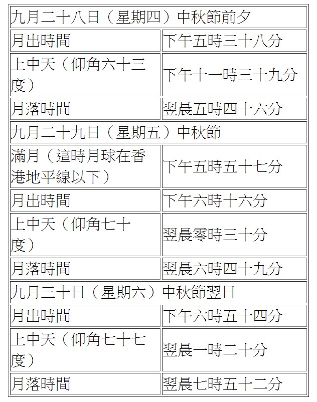 香港新聞網9月18日電 今年9月29日(星期五)是中秋節,滿月會在黃昏時分出現。若天氣情況許可,巿民可於中秋節前後的晚上觀賞到又大又圓的明月。為方便市民賞月,下表列出中秋節前後月出、月上中天、月落及滿月的時間。“上中天”是月球橫越本地子午線的時刻,這時月球位於正南方,仰角為全晚最高。