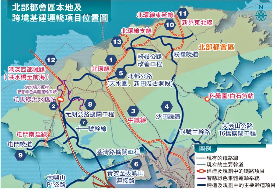 香港北部都會區本地及跨境基建運輸項目位置圖。香港特區政府新聞處資料圖 【本地基建】 ①北環線 第一階段先在現有的東鐵線落馬洲支線隧道上方興建古洞站,項目已於2023年9月動工,目標在2027年竣工。第二階段為北環線主線,全長約10.7公里,連接屯馬線錦上路站與東鐵線古洞站,途經凹頭、牛潭尾和新田3個中途站,目標在2034年完成。完成後的北環線與現有的東鐵線及屯馬線,將形成一個貫通新界和九龍市區的環狀鐵路網,不但改善現有的鐵路網絡連接,服務古洞北新發展區及新田科技城,加強河套區的對外交通聯繫,更會釋放凹頭、牛潭尾及新田一帶土地的潛力,帶動有關地區的發展。 ②屯馬線洪水橋站 設於現有的屯馬線天水圍站及兆康站之間,服務洪水橋/廈村新發展區及鄰近地區的居民,支持新發展區的人口和就業持續增長。現時繁忙時段由洪水橋/廈村新發展區利用路面交通往返天水圍站或兆康站需時約20至25分鐘。洪水橋站啟用後,以鐵路行走相同路程預計需時約4分鐘,洪水橋站已於去年4月開展前期工程,在現有的屯馬線高架鐵路橋兩側騰出空間供將來接駁兩側新建的車站月台,現已大致完成。 項目主體工程於去年12月開展,土地平整工程大致完成,隨後進行相關地基工程,整個項目預計於2030年竣工。 ③中鐵線 全長約17公里,由元朗錦田途經葵湧連接九龍塘。中鐵線將連接其他現有及擬議的鐵路線,包括屯馬線、荃灣線、觀塘線、東鐵線、北環線、北環線東延線及新界東北線,為市民提供更直接及快捷的路線往返北部都會區與港九各區。未來中鐵線將接通北部都會區及維港都會區,以支持北部都會區的持續發展。 ④沙田繞道 全長約15公里。相較現時的吐露港公路和大埔公路,沙田繞道將會是一條走線較直接的南北走廊,貫通新界東北及九龍市區;北端將接駁大埔的粉嶺公路,除了北區的道路使用者外,亦方便大埔、太和、康樂園、林村及泰亨一帶的居民出行;而南端則連接九龍西的長沙灣附近的現有主要幹道網絡。 沙田繞道將為新界東居民提供更快捷途徑前往市區,完善南北運輸網絡並紓緩吐露港公路的壓力。 ⑤北都公路 全長約23公里,由西至東分別為天水圍段、新田段、古洞段及新界北新市鎮段,貫通北部都會區內各個發展重心,包括牛潭尾、新田科技城、古洞北/粉嶺北及新界北新市鎮,打通新界北的東西脈絡,形成新的東西走廊,大幅提升新界北部地區的策略性道路網的運輸效能,並為新發展區建立良好運輸建設的基礎。北都公路通車後,在繁忙時段能有效分流約40%往返新界東西的交通流量,紓緩現有道路的交通壓力。 ⑥青衣至大嶼山連接路 旨在改善預期於青嶼幹線出現的交通情況, 創造容量以配合新界西北、大嶼山和香港國際機場的長遠發展需要。青衣至大嶼山連接路作為整組策略性幹道的一部分, 連同十一號幹線及其他相關主要幹道將可改善新界西北來往市區主要道路的交通情況, 並增加大嶼山來往市區的路線選擇, 加強整體道路網絡對交通事故的應變能力。 ⑦十一號幹線(元朗至北大嶼山段) 是一條連接新界西北及市區的主要幹道。本工程目的是改善新界西北對外道路的交通情況及支持新界西北擬議發展。十一號幹線亦可以增加新界西北來往市區的路線選擇及加強道路網絡對交通事故的應變能力。 ⑧元朗公路 (藍地至唐人新村段)擴闊工程 工程項目主要包括擴闊一段介乎藍地石礦場至唐人新村交匯處的元朗公路,由雙程三線分隔行車道改為雙程四線分隔行車道,從而提升該段元朗公路的容量,並加強十一號幹線與元朗南發展的連接,以配合十一號幹線的落成及新界西北未來發展的交通需求。 ⑨屯門繞道 一條連接屯門-赤鱲角隧道及元朗公路(近藍地石礦場)的主要幹道。建設本工程是要促進新界西北的主要幹道網絡及改善屯門區內道路的交通情況。落成後屯門繞道將有助分流屯門道路的交通,尤其是屯門公路(虎地段及市中心段)和皇珠路。屯門道路的容車量因此得到釋放,並能支持屯門西及新界西北各個擬議的發展。 ⑩北環線東延線 全長約9.5公里,從古洞站為起點向東延伸至坪輋,途經新界北新市鎮的各個發展節點,有效連接新發展區至鐵路網絡。其終點站將提供轉乘至新界東北線。 ⑪新界東北線 全長約8.5公里,由香園圍途經坪輋及皇后山等地區連接東鐵線粉嶺站,打通新界北新市鎮的主要發展節點,方便市民使用香園圍口岸及轉乘東鐵線。 【跨境基建】 ⑫港深西部鐵路(洪水橋至前海) 全長約18.1公里,全線以地下形式興建,並設5個車站,其中3個在香港側,並會在深圳側設“一地兩檢”口岸,香港境內不設清關設施。兩地政府的目標是於2035年同步開通港深西部鐵路香港段和深圳段,因此港府會爭取在25個月內,完成相關勘查研究工作,有關費用逾3.3億元,按付款當日價格計算。 ⑬北環線支線 全長約5.8公里,走線由北環線主線新田站出發,途經新田科技城及河套區港深創新及科技園,再接入深圳的新皇崗口岸,預計今年內開展詳細規劃及設計,目標是讓北環線支線提早與北環線主線於2034年或之前同步開通。(完) 【編輯:豐悅】