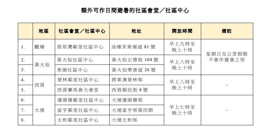 今天(7月7日)一早,香港天文台繼續發出酷熱天氣警告。香港民政事務總署昨日(6日)表示會繼續開放19間社區會堂和社區中心作臨時避暑中心。香港中通社資料圖 香港民政事務總署指,臨時避暑中心會在酷熱天氣警告生效期間全日開放予市民避暑。此外,在晩上10時30分至翌晨8時,臨時避暑中心亦供應被鋪及睡覺的地方予有需要人士。中心內有人員當值。如需進一步資料,可於午夜前致電民政事務總署熱線2572 8427查詢。 香港臨時避暑中心的地點如下: 【香港島】: 中西區-西營盤高街2號西營盤社區綜合大樓3樓西營盤社區綜合大樓社區會堂 東區-銅鑼灣福蔭道7號3樓銅鑼灣社區中心 南區-鴨脷洲利東邨利東社區會堂 灣仔-灣仔皇后大道東258號灣仔街市地下低層灣仔活動中心 【九龍】: 九龍城-紅磡庇利街42號九龍城政府合署1樓紅磡社區會堂 觀塘-藍田啟田道71號藍田(西區)社區中心 深水埗-深水埗石硤尾邨 42 座地下石硤尾社區會堂 黃大仙-慈雲山雲華街45號慈雲山(南區)社區中心 油尖旺-油麻地眾坊街60號梁顯利油麻地社區中心 【新界】: 離島-東湧文東路39號東湧市政大樓地下東湧社區會堂 葵青-葵湧葵盛西邨第六座平台葵盛社區會堂 北區-粉嶺祥華邨祥華社區會堂 西貢-將軍澳坑口培成路38號西貢將軍澳政府綜合大樓地下坑口社區會堂 沙田-沙田隆亨邨隆亨社區中心 大埔-大埔鄉事會街2號大埔社區中心 荃灣-荃灣梨木樹邨康樹樓地下梨木樹社區會堂 屯門-屯門蝴蝶邨(近蝶心樓)蝴蝶灣社區中心 元朗-元朗朗屏邨朗屏社區會堂 元朗-天水圍天耀邨天耀社區中心 除以上臨時避暑中心外,部分社區會堂和社區中心亦會於開放時間內供市民作日間避暑之用,詳細地址見下表: