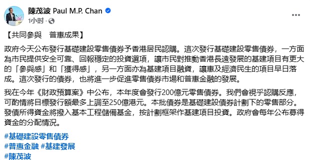 當日推出總值20億港元的十年期政府債券,債券的投標申請總額達105.45億港元。投標對發行額比例,即債券的投標申請總額對債券的發行總額的比例,為5.27。平均接納價是100.43,即以年率計的收益率為3.144厘。(完)