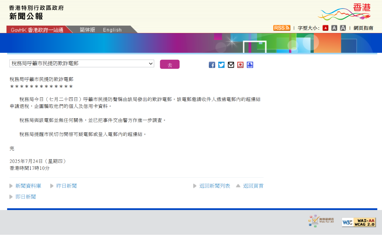 稅務局提醒市民切勿開啓可疑電郵或登入電郵內的超連結。  (完)