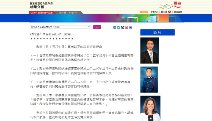 香港新聞網11月4日電 香港特區政府4日宣布,現任財經事務及庫務局副秘書長(庫務)陸嘉健將於今年11月6日出任土地註冊處處長,接替將於同日展開退休前休假的譚惠儀。 公務員事務局局長楊何蓓茵說:“陸先生為資深政務主任,具備出色領導和管理才能。我有信心他會在新崗位繼續為市民提供專業高效的服務。” 對於即將退休的譚惠儀,楊何蓓茵表示:“譚女士在過去35年一直盡忠職守,對工作熱誠投入。她在出任土地註冊處處長期間,展現卓越領導才能,帶領土地註冊處持續改善土地註冊制度。她推動《2025年業權及土地的註冊(雜項修訂)條例草案》的立法工作,為推行業權註冊制度於新批土地先行奠定穩健基礎。我衷心祝願她退休生活充實愉快。” 以下為兩位官員的個人簡歷: