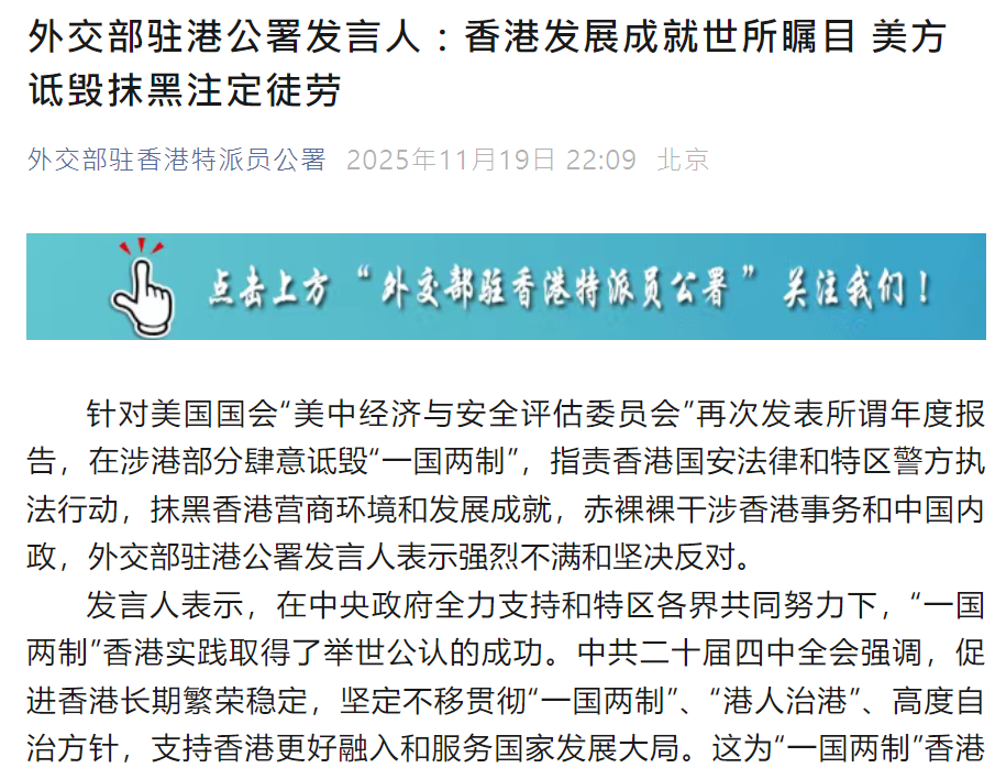 香港新聞網11月19日電 針對美國國會“美中經濟與安全評估委員會”再次發表所謂年度報告,在涉港部分肆意詆毀“一國兩制”,指責香港國安法律和特區警方執法行動,抹黑香港營商環境和發展成就,赤裸裸干涉香港事務和中國內政,外交部駐港公署發言人表示強烈不滿和堅決反對。