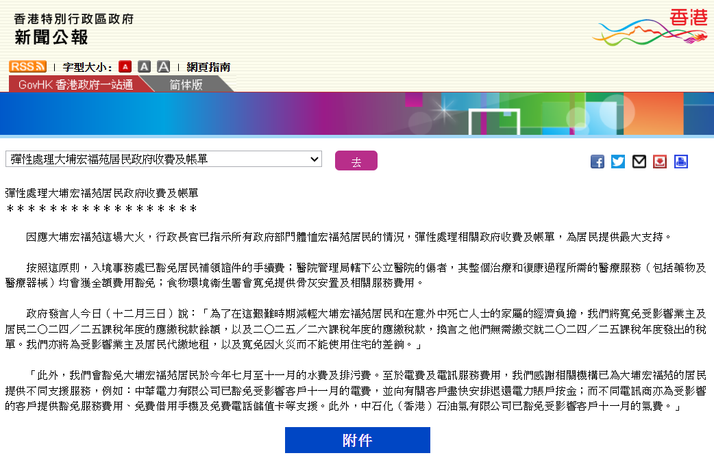 按照該原則,入境事務處已豁免居民補領證件的手續費;醫院管理局轄下公立醫院的傷者,其整個治療和復康過程所需的醫療服務(包括藥物及醫療器械)均會獲全額費用豁免;食物環境衞生署會寬免提供骨灰安置及相關服務費用。 政府發言人3日表示,為了在這艱難時期減輕大埔宏福苑居民和在意外中死亡人士的家屬的經濟負擔,我們將寬免受影響業主及居民2024/25課稅年度的應繳稅款餘額,以及2025/26課稅年度的應繳稅款,換言之他們無需繳交就2024/25課稅年度發出的稅單。我們亦將為受影響業主及居民代繳地租,以及寬免因火災而不能使用住宅的差餉。” 此外,政府會豁免大埔宏福苑居民於今年7月至11月的水費及排污費。至於電費及電訊服務費用,感謝相關機構已為大埔宏福苑的居民提供不同支援服務,例如:中華電力有限公司已豁免受影響客戶11月的電費,並向有關客戶盡快安排退還電力賬戶按金;而不同電訊商亦為受影響的客戶提供豁免服務費用、免費借用手機及免費電話儲值卡等支援。此外,中石化(香港)石油氣有限公司已豁免受影響客戶11月的氣費。 (完) 【編輯:譚暢】