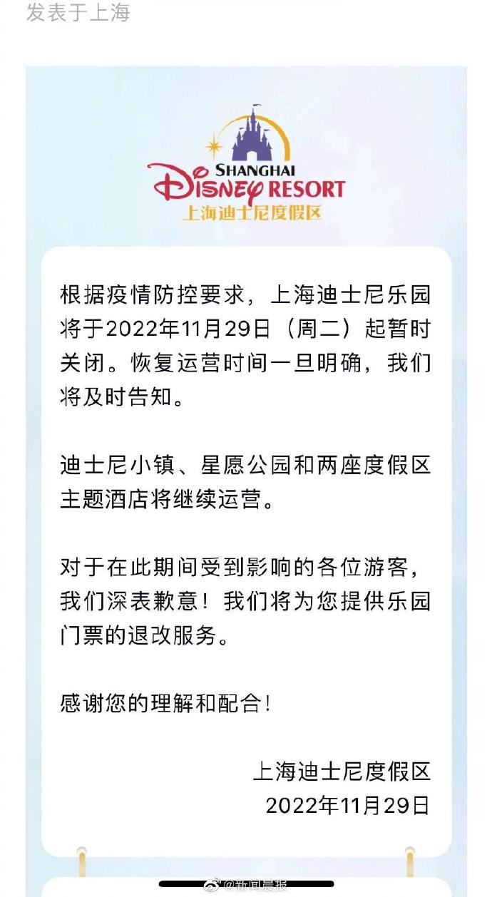 香港新聞網11月29日電 據上海迪士尼度假區最新消息,根據疫情防控要求,上海迪士尼樂園將於2022年11月29日(周二)起暫時關閉。恢復運營時間一旦明確,將及時告知。期間,迪士尼小鎮、星願公園和兩座度假區主題酒店將繼續運營。上海迪士尼度假區將提供樂園門票的退改服務。