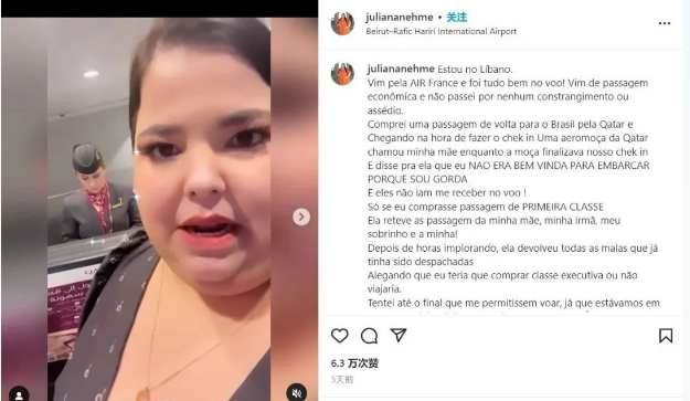 香港新聞網11月30日電 綜合外媒報道,巴西女模特兼網紅朱利安娜(Juliana Nehme)11月22日在社交媒體上傳了一段視頻,稱其與家人前往黎巴嫩旅游,本計劃從黎巴嫩貝魯特機場搭乘卡塔爾航空航班,飛到卡塔爾首都多哈轉機回家鄉,卻因為體型被卡塔爾航空拒絕上機。朱利安娜稱,卡塔爾航空工作人員稱其身材過於肥胖,座位太小,因此拒絕讓其登機,除非她願意再花費3000美元(約合23444港幣)購買頭等艙機票。