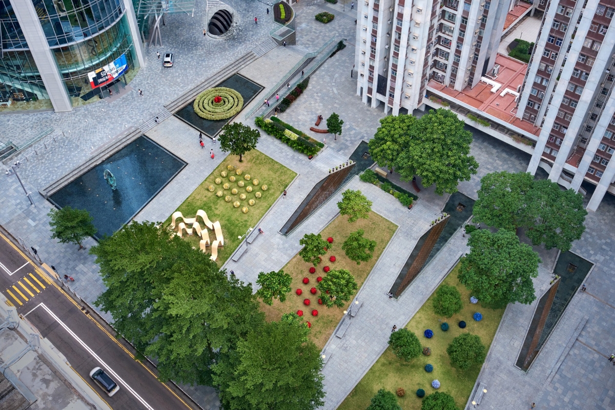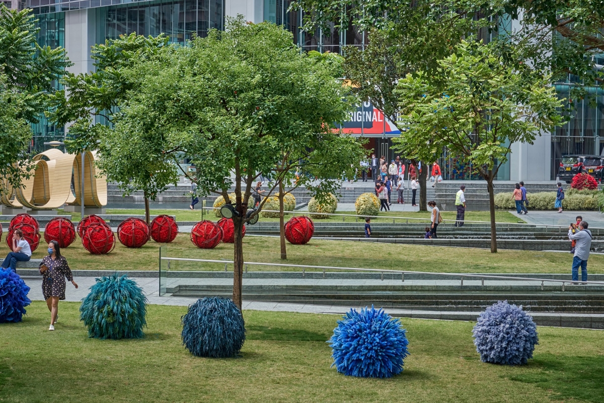 太古公園鳥瞰圖(圖片:太古地產) 花藝師鄭蘶巧用50多種鮮花和乾花等有機材料,以人手製作4組雕塑作品拼湊成植物藝術系列,透過色彩繽紛的球形花藝裝置,寓意四季輪轉的自然循環。4組花藝雕塑分別設於太古公園、林肯大廈天橋和港島東中心。藝術裝置由即日起至12月31日於太古坊展出,歡迎市民到訪參觀,體驗洋溢創意的沉浸式遊樂場,一同慶祝太古地產的重要里程碑。
