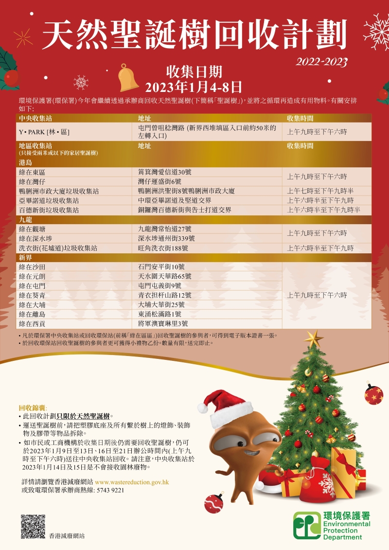 2022-23天然聖誕樹回收計劃: 收集日期:2023年1月4至8日(共5天) 收集地點:指定的中央收集站及地區收集站 (名單及詳情可瀏覽香港減廢網站) *留意部分回收站只回收2米或以下的天然聖誕樹 注意事項:送往回收前先拆除燈飾、膠底座、裝飾及膠帶等物品 環保署亦呼籲,市民可將其他小型植物如聖誕花重新栽種;塑膠製的聖誕樹及裝飾物則可儲存再用,以實踐惜物減廢。 【編輯:黃璇】