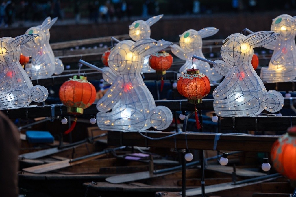 “兔子船”停泊在西湖二公園碼頭附近(圖片:杭州網) 船上可愛的兔子燈由中國紙雕藝術家溫秋雯設計製作,在傳統的花燈工藝紮製基礎上進行了微創新,透過兔子身軀可看見其內部構造。小兔子提著的福字燈籠,用的布料圖案則來源於宋畫中的民間女裝花色——蓮花,寓意著吉祥福壽。