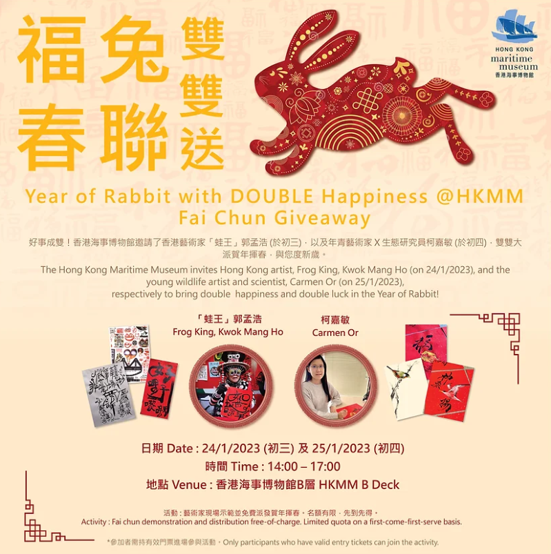 福兔春聯雙雙送 日期:1月24日及25日(年初三及年初四) 時間:每日下午2時至5時 地點:香港海事博物館B層(香港中環八號碼頭) 【編輯:黃璇】