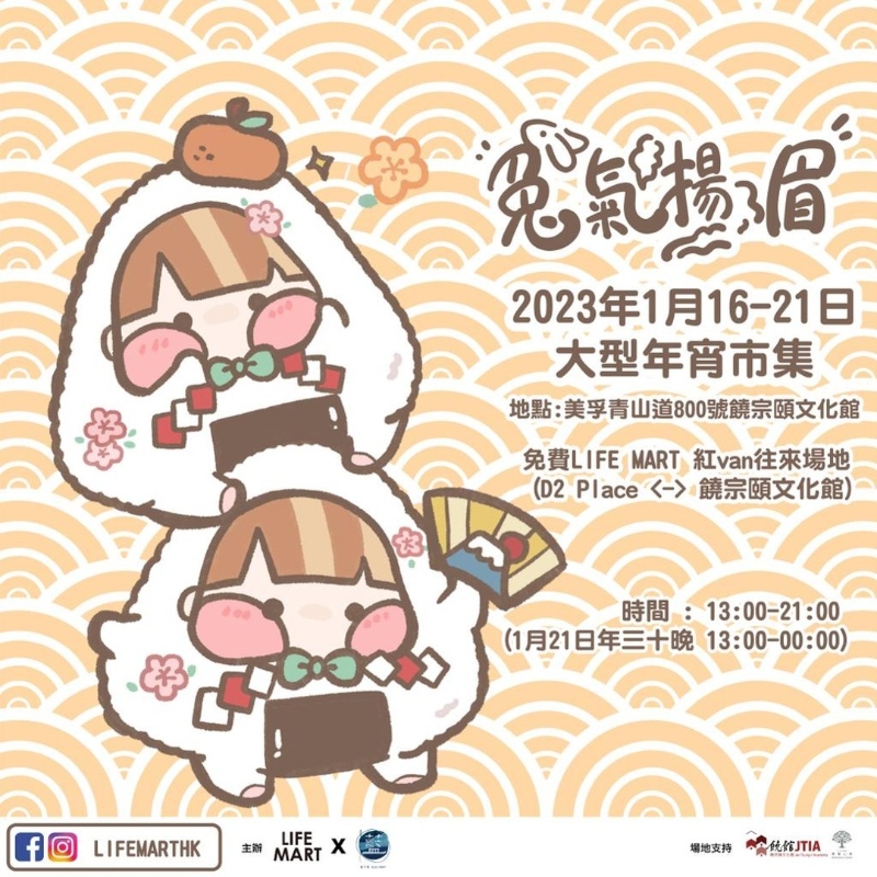 兔氣揚眉大型年宵市集 日期 : 即日起至1月21日(年三十) 時間 :下午1時至晚上9時(1月21日特別開放至22日0時) 地點 : 饒宗頤文化館(美孚青山道800號) 費用:免費入場 【編輯:黃璇】