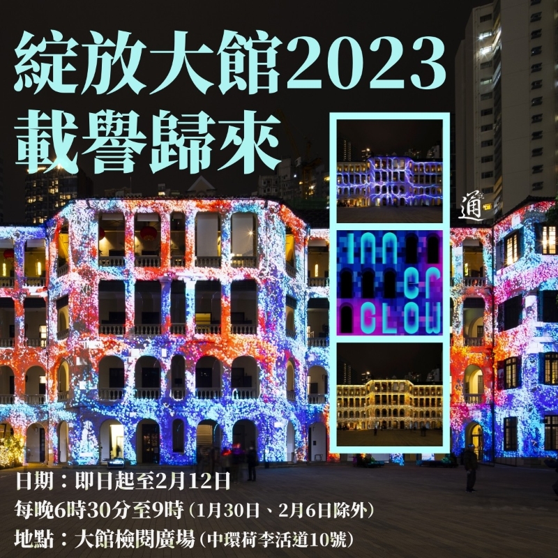 綻放大館2023光雕匯演(圖片:大館) 作為大館的藝術及歷史文物節目之一,是次匯演是由香港賽馬會慈善信託基金提供主要資助,並同時獲中電控股有限公司為首席贊助。 光雕匯演日期及時間: 即日起至2月12日每晚6時30分、7時、7時30分、8時、8時30分、9時 (1月30日、2月6日除外) 光雕匯演地點:大館檢閱廣場(香港中環荷李活道10號) 費用:免費入場 【編輯:黃璇】