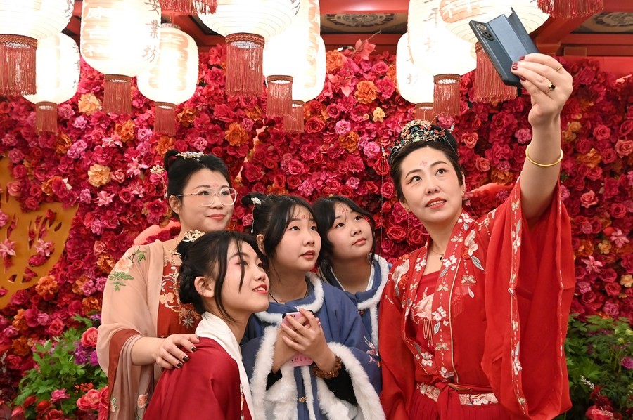 香港新聞網1月30日電 春節期間,位於西安市曲江新區的“長安十二時辰”沉浸式唐風市井生活街區迎來旅遊高峰。在這個涵蓋唐食薈萃、百藝手作、文化宴席、沉浸演藝等多種業態的街區裏,許多遊客身著漢服、繪上美妝,遊覽、留影,感受大唐風貌,體驗“唐潮”之旅。