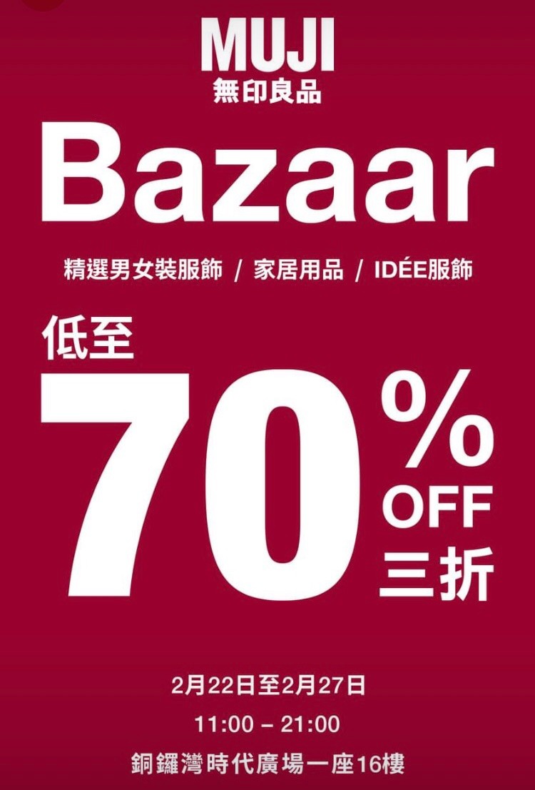香港新聞網2月20日電  MUJI無印良品宣布於銅鑼灣時代廣場一座16樓舉行開倉優惠,由2月22日(星期三)起至2月27日,於Bazaar場內購買精選男女服飾、家居精品、IDÉE服飾低至3折,大家可以記下日子去掃貨啦!