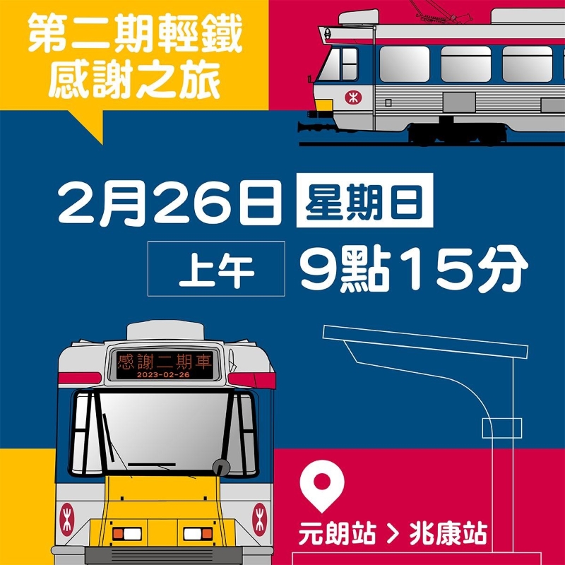第二期輕鐵列車1992年正式投入服務 第二期輕鐵感謝之旅 日期:2月26日(星期日) 時間:上午9時15分至11時 地點:由輕鐵元朗站1號月台開往輕鐵兆康站4號月台,之後會在兆康站稍作停留,供大家影相留念。 【編輯:黃璇】