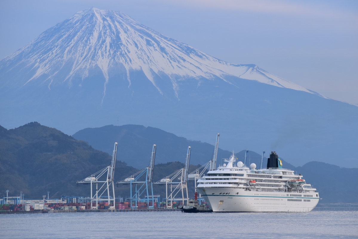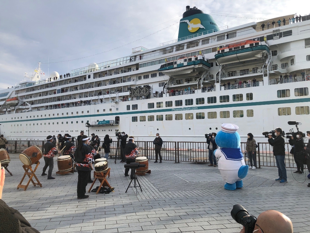 阿瑪德亞號(MS Amadea)停泊清水港(圖片:國土交通省港灣局) 昨日上午8時許,總部位於德國波恩的鳳凰旅遊(Phoenix Reisen)旗下的阿瑪德亞號(MS Amadea)郵輪,抵達背靠富士山的清水港,部分市民表演“和太鼓”歡迎船上旅客到來。上午9時過後,完成健康狀態確認的旅客陸續下船。