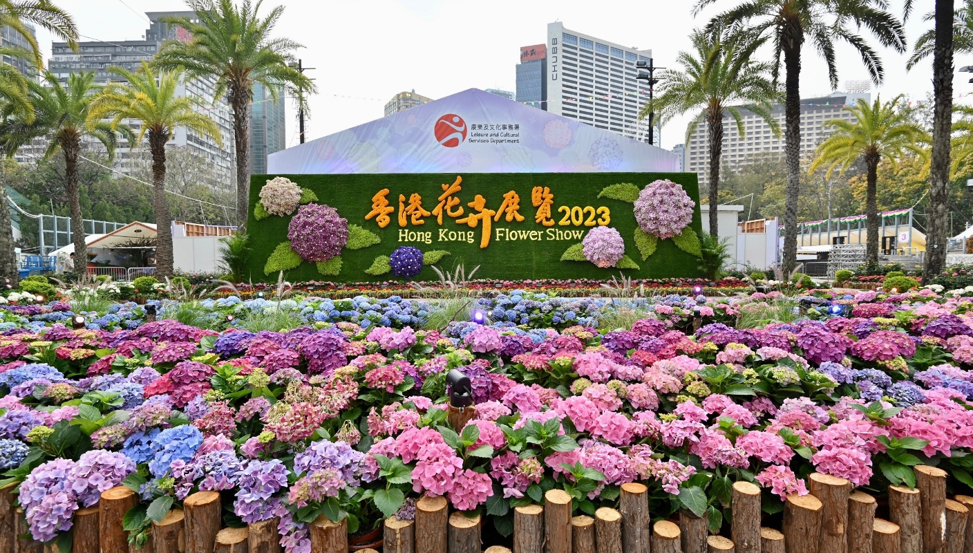 香港新聞網3月9日電 2023年香港花卉展覽(花展)明日(3月10日)至3月19日,每日上午9時至晚上9時,在銅鑼灣維多利亞公園(維園)舉行。今年花展的主題花是繡球花,以“繡麗綻放、幸福滿載”為主題。 花展將展出約40萬株花卉,包括約4萬株繡球花,市民可在鬧市中欣賞到色彩斑斕的花花世界。