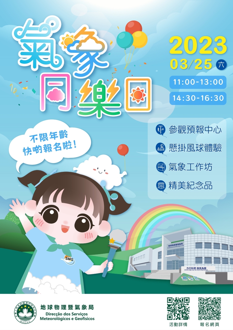 澳門“氣象同樂日”活動海報 “氣象同樂日”活動在澳門氹仔大潭山氣象局大樓舉行,並設上、下午場次,每場名額60人,每名報名者最多可登記4人,活動不設年齡限制,費用全免。倘報名人數超過名額上限,主辦方將以隨機抽籤形式決定,錄取人士將於3月20日前獲短訊通知。如欲瞭解更多活動詳情,請掃描活動海報上的二維碼或瀏覽氣象局網頁www.smg.gov.mo/zh/news-detail/406,還可關注“地球物理暨氣象局”微信號,以及“澳門天氣”APP和Instagram。 【編輯:黃璇】