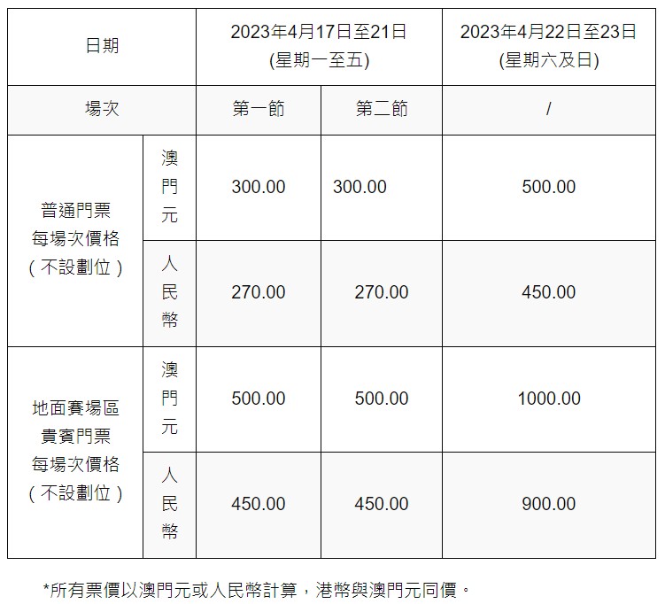 賽事門票價格表 指定日子普通門票設購票優惠 4月17至21日之普通門票設有購票優惠,一次購買同一賽事日同一場次4張普通門票可享九折優惠;持有澳門全日制學生證之學生及65歲或以上之澳門居民可以半價購買4月17日至21日第一節比賽之普通門票,每人限購每賽事日1張優惠門票,數量有限,售完即止,且不可與其他優惠同時使用。購買學生及長者優惠票的觀眾入場時須出示有效澳門學生證或有效身份證明文件,否則需付全額費用。“生活補貼計劃”不適用於購買本活動門票。 有關賽事詳細資料,請瀏覽賽事網頁wttmacao.sport.gov.mo、世界乒乓球職業大聯盟(WTT)網頁worldtabletennis.com,或關注“澳門體育盛事”Facebook專頁、“澳門體育”微信公眾號及“澳門特區體育局”微信訂閱號。 【編輯:黃璇】