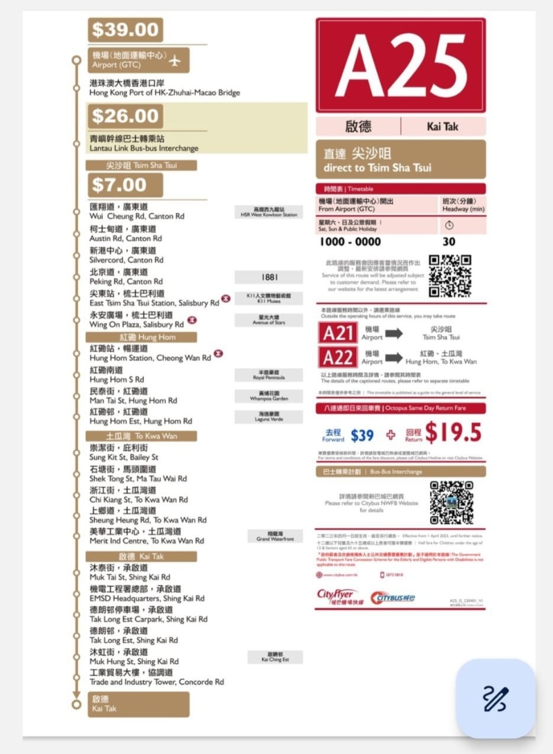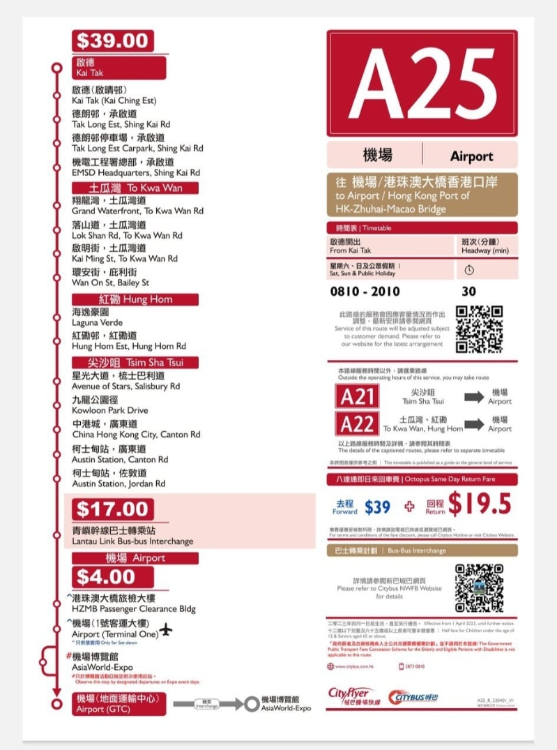 城巴4月1日開通全新A25機場快線(圖片:城巴提供) 全新的A25號線來往啟德、港珠澳大橋香港口岸及機場,開辦初期會於星期六、日及公眾假期提供服務。由啟德(協調道)開出,經啟晴邨、德朗邨、土瓜灣、紅磡、黃埔、尖沙咀梳士巴利道、九龍公園徑及廣東道,前往港珠澳大橋香港口岸及機場。 由啟德(協調道)開出的班次服務時間為星期六、日及公眾假期上午8時10分至晚上8時10分,每30分鐘一班。 由機場(地面運輸中心)開出的班次服務時間為星期六、日及公眾假期上午10時至凌晨12時,每30分鐘一班。全程車費為39港元。