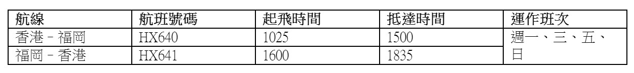 此新航線每週四班,採用空中巴士A320客機營運。為慶祝航線投入服務,香港航空近日於香港國際機場及福岡國際機場舉行慶祝活動。 香港航空行政總裁孫劍鋒表示:“我們很榮幸將福岡加入香港航空逐步恢復的航線網絡中。福岡是通往九州的重要門戶,開拓此新航點將有助加強我們於九州地區的營運,為未來開通更多日本航點作準備。”香港航空計劃於今年內恢復鹿兒島直航服務,進一步加強於九州地區的業務發展。 繼加入每週四班的福岡航線後,香港航空目前的日本航線網絡覆蓋五大航點,包括每日2班分別前往大阪及東京(成田)、每日一班往返沖繩、以及每週3班往來札幌之航班。另外,公司將於5月起加密沖繩班至每日2班;6月起則增加東京(成田)航班至每日3班。 香港航空來往香港及福岡的航班時間表*如下(所有時間均為當地時間):