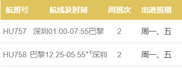 深圳直飛巴黎的航班由海南航空執飛,一周安排兩班,逢周一和周五運營。去程航班在北京時間凌晨1:00起飛,早晨7:55抵達。回程航班在巴黎時間12:25起飛,次日清晨5:55抵達。