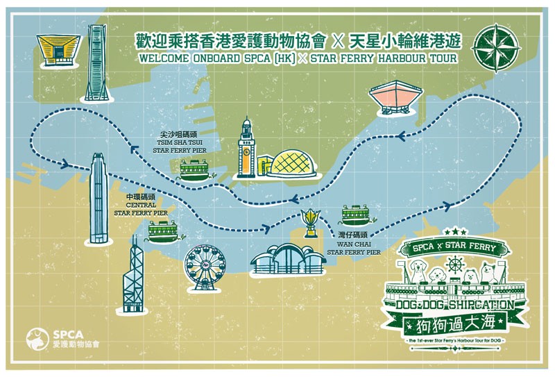 “狗狗過大海”活動示意圖。 天星小輪一直被譽為香港標誌之一,更有國際媒體把乘搭天星小輪遊覽維港列為“人生50個必到景點”及“宜居香港的31個理由”之一。在“狗狗過大海”的航程中,主人和毛孩都能盡情享受國際知名的維港海景。 各位參與者給“狗狗過大海”的慷慨支持及善款,除能支援有需要動物,幫牠們早日找到幸福歸宿外,更能進一步於香港推廣寵物友善交通,打造人寵共融城市! “狗狗過大海”活動詳情 4月29日(星期六)下午3時、5時 4月30日(星期日)下午1時、3時、5時 集合地點:中環7號碼頭 航程距離:45分鐘維港遊 詳情:按此瀏覽 【編輯:黃璇】