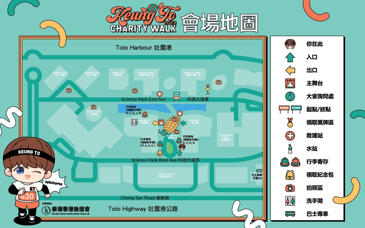 3米高充氣小濤濤及打卡位 今次“Keung To Charity Walk 2023”的步行籌款活動,起點及終點設於科學園科技大道東,繞過大廣場、科研路至吐露港畔的白石角海濱長廊然後折返回起點,全程1.5公里,沿途擺放小姜姜、小濤濤可愛造型不倒翁、生日主題打卡佈景板以及頒獎台等,讓參加者邊步行邊打卡,跑手需在30分鐘內完成行程,完成後可領取完成紀念品,並於天幕廣場繼續打卡留念。