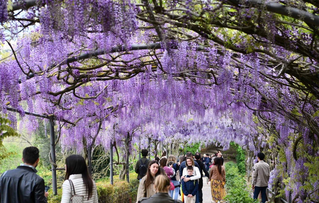 香港新聞網4月26日電 本周一(4月24日),意大利佛羅倫薩巴爾迪尼花園(Giardino Bardini)的紫藤花盛放,吸引眾多遊客前來觀賞。 紫藤花,垂散而下宛如瀑布的紫色花朵,綻放於春季到初夏時期。紫藤花的特徵是有著最長可達到1米的長垂枝,並由許多紫花相連綻放,如同紫色的稻穗。特別是當紫藤花的藤蔓與高大的竹子和樹木纏繞而成藤架,更是成了注目的焦點。