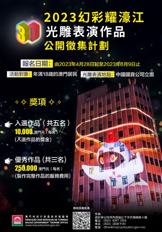 展現本地文創潛力 促“旅遊+”融合 “2023幻彩耀濠江”於今年12月起舉行,在澳門不同區份帶來光雕表演、燈光裝置和互動遊戲等。澳門旅遊局現進行澳門公開徵集“2023幻彩耀濠江”的3D光雕表演作品,吸納更多本地公共藝術創作,展現本地文創潛力,促進“旅遊+”跨界融合,鼓勵數字技術融入夜間旅遊盛事。 優秀光雕作品亮相今年“幻彩耀濠江” 旅遊局邀請藝術及旅遊範疇人士擔任評審團,評選出5個入選作品並將在旅遊局網站展示,旅客及居民可以不受時間和地域限制“雲”觀賞。評審團並將在5個入選作品當中評選出3個優秀作品於“2023幻彩耀濠江”活動期間在“中國國貨公司”立面展演,增加夜間旅遊品牌活動的附加價值,有效聯動“旅遊+文創”。 即日起接受報名 “2023幻彩耀濠江–3D光雕表演作品公開徵集計劃”(澳門)即日起至6月9日接受報名,活動對象為年滿18歲的澳門居民,有意參加者可於線上報名及提交作品,詳情請瀏覽旅遊局的澳門旅遊業界網站:industry.macaotourism.gov.mo。評選結果將在旅遊局網站公佈。 【編輯:黃璇】