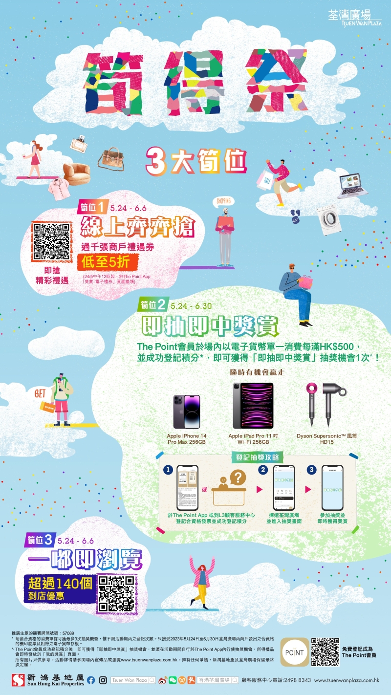 荃灣廣場“筍得祭”回歸,推出3大筍位。 筍位1):低至5折!逾千張商戶禮遇券“線上齊齊搶” 手快有,手慢就走寶!由即日至6月6日,荃灣廣場將推出“線上齊齊搶”活動,過千張商戶禮遇券於The Point App讓各位會員驚喜瘋搶,破天荒優惠層出不窮,折扣低至5折,當中不少更是夏日必備單品,包括:Itsu IS-0131 迷你按摩槍(15折)、Derma Elements面膜買一送一優惠(半價)、OPTICAL 88 COVER+Sun寶麗萊外掛式太陽眼鏡(半價)、Bonluxe基本型功能胸圍(半價)、CMK Electrical Store TCL 1匹WI-FI智能變頻冷暖分體式冷氣機(51折)等,精彩禮遇不容錯過,快來“筍”過夏日! 筍位2):全方位至筍生活!匯聚多間人氣商戶、逾140個“到店優惠”登場 由即日至6月6日,荃灣廣場與場內逾多間人氣商戶聯手推出逾140個“到店優惠”,全面覆蓋衣食住行各方面:由服裝時尚、運動用品、珠寶配飾、美容保健等個人形象管理,到影音家電、家居佈置等打造舒適生活空間,再到美饌薈萃一嚐人間美味,食、買、玩一應俱全,數量有限,快掃場內QR Code一次過掌握您的心頭好! 筍位3):消費參加“即抽即中獎賞”筍贏潮人最愛Apple及Dyson產品 由即日至6月30日,The Point會員於場內以電子貨幣單一消費每滿HK$500並成功登記積分,即可於The Point App內獲得抽獎機會1次(每套合資格的消費單據可獲最多3次抽獎機會),隨時有機會贏Apple iPhone 14 Pro Max 256GB、Apple iPad Pro 11吋Wi-Fi 256GB及Dyson Supersonic™風筒 HD15等電器、寢具、精品及The Point積分獎賞!活動期內的登記次數不限。