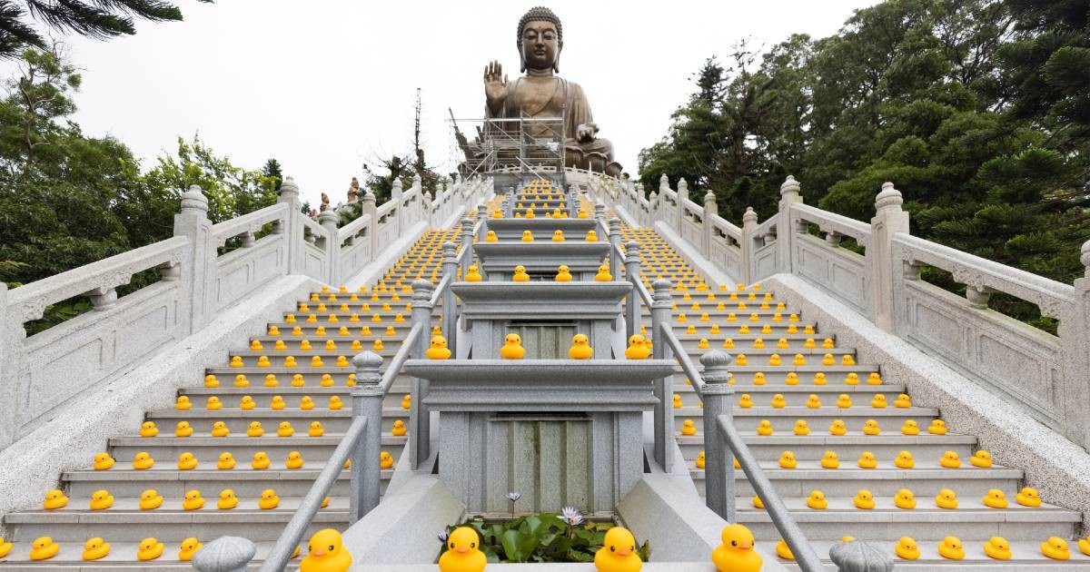 近5,000隻橡皮鴨現身天壇大佛。 此次橡皮鴨快閃天壇大佛活動由昂坪360義工隊發起,與社福機構鄰舍輔導會的義工們,近50名義工共同完成,傳遞橡皮鴨友愛大同的正面訊息予社會各界。義工們合力將近5,000隻橡皮鴨排列在全球最高的戶外青銅坐佛天壇大佛下的268級石階,與大佛合照,場面壯觀! 橡皮鴨亦將登陸昂坪市集,準備在6月13日至9月3日舉辦的《橡皮鴨二重暢》遊昂坪360活動與公眾見面。市民和旅客亦可於即日起,於昂坪市集“香港有愛”商店以50港元購買首批1,000隻昂坪360獨家發售的橡皮鴨,收益將全數捐予鄰舍輔導會。每人限買一隻,先到先得,售完即止。 而活動結束後,昂坪360會檢查所有曾經展出的橡皮鴨,並為狀態良好的橡皮鴨清潔,再安排轉送鄰舍輔導會的受惠人士或再用作義賣用途。 【編輯:黃璇】