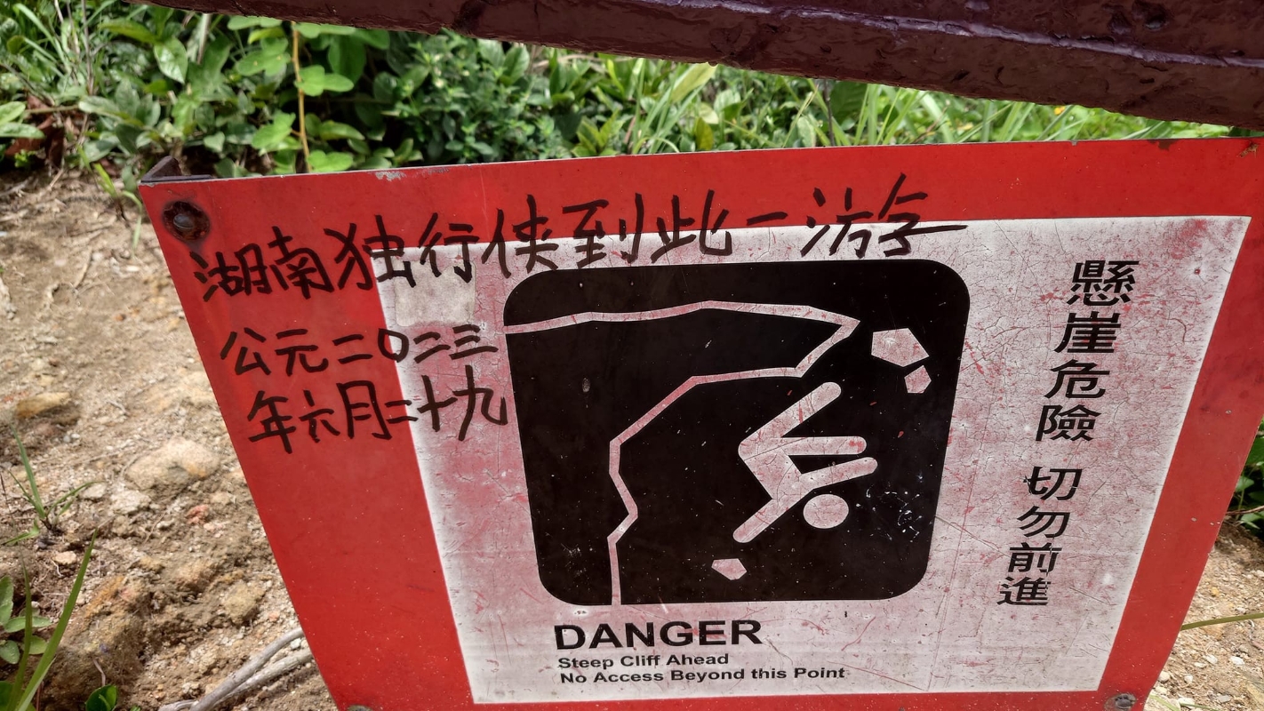 “湖南獨行俠到此一遊”塗鴉。(圖片:Facebook“香港人露營分享谷”) 網民在Facebook群組“香港人露營分享谷”上貼出圖片,帖子只附上一個憤怒的表情。圖中為一塊紅白色的警示牌,提醒前方懸崖有危險,遊客切勿再繼續前進。惟警告牌上有一串由黑色油性筆寫上的中文,寫道“湖南獨行俠到此一遊”等字眼,還仔細地寫上日期為“公元二〇二三年六月二十九”。網民猜測日期正是塗鴉當天,地點推測是獅子山。後來亦有網民指,“湖南獨行俠”塗鴉在不只一處出現,香港其他地方亦發現其踪影,包括港島龍脊。