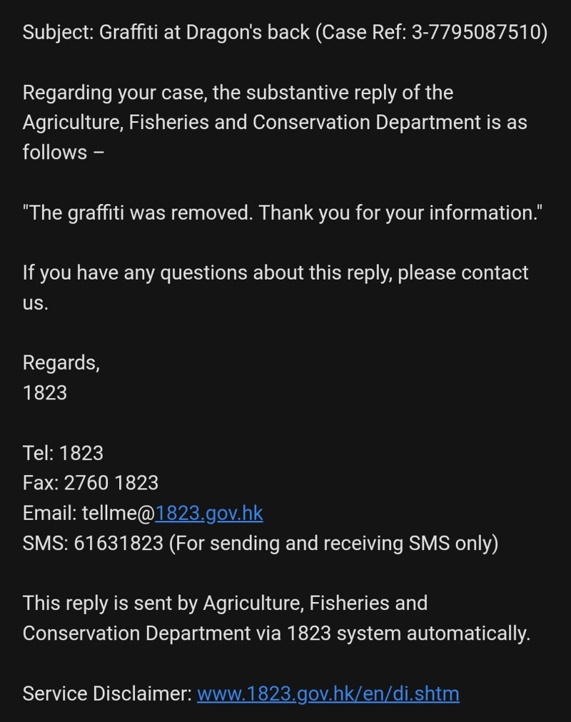 有山友七一行龍脊,亦見到“湖南獨行俠到此一遊”塗鴉。(圖片:Facebook“香港人露營分享谷”) 截至發稿日期,有網友在該條貼文下方分享,漁農自然護理署已接獲投訴並派出工作人員清理塗鴉。網友稱,漁護署回覆此類(木頭標柱上的)塗鴉需要用打磨機才可以清除乾淨。