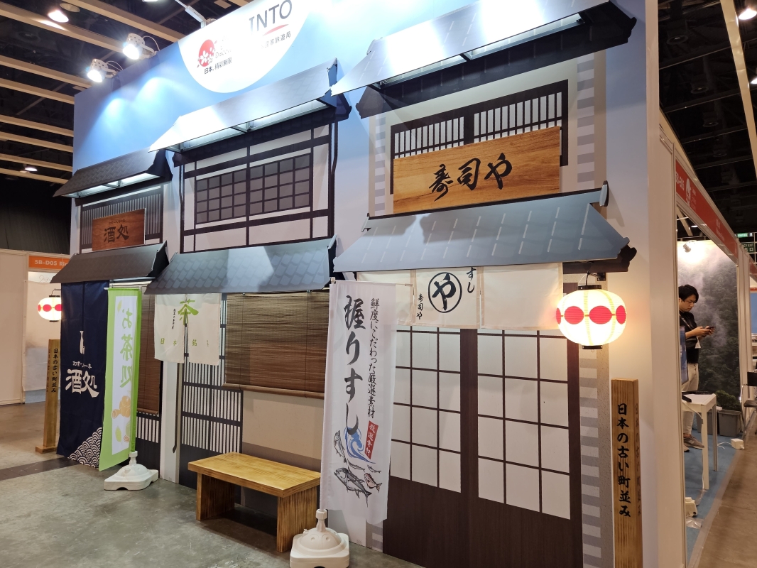 “沉浸式日本傳統文化體驗館”位於會展中心展覽廳5B。(香港中通社記者 黃璇攝) 重現充滿昔日風情的老街場景 古色古香的日本老街有著令人沉醉的魅力,JNTO於書展中重塑出富有舊時代氣息的城鎮風貌,讓大家沉浸於日本傳統文化之中。JNTO的傳統文化體驗館參考了日本多條百年古老街道設計而成,街上的和食店、茶館及雜貨店等都極具日式風情。歡迎大家盡情打卡,在老街上漫步享受日本傳統氣氛。 上演傳統劍球表演 分享日本各地必到景點 除了重現老街場景,JNTO亦安排了各項精彩舞台活動,讓大家認識日本傳統文化之餘,同時更深入了解日本各地旅遊資訊。