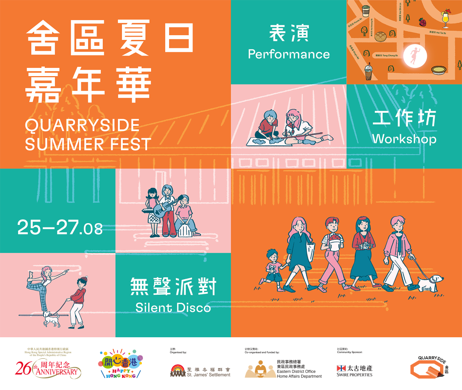 鰂魚涌全新海濱社區休憩空間“舍區”。 當中重頭戲為在8月26日黃昏舉行的音樂表演,多元音樂種類為觀眾帶來不一樣的音樂體驗,嘉賓陣容包括香港唱作歌手張進翹、年輕獨立歌手藍奕持、爵士吉他手關家傑 x 琴鍵手黃樂其,以及無伴奏合唱組合“半肥瘦”,燃點夏日熱鬧氣氛。 “舍區夏日嘉年華”亦設有14項免費工作坊,市民可以參與製作竹編涼扇、花生糖、升級廚餘首飾、水果發酵茶和咖啡品嚐工作坊等,體現文化工藝,也將創意帶進生活。親子活動也有《海洋大冒險》繪本劇場、流動圖書車、家園色彩派對工作坊等,讓大人及小朋友都可以歡度夏日。有興趣參與免費工作坊的市民可於即日起於網上登記,名額有限,先到先得。 此外,在活動的社區贊助機構太古地產支持下,鰂魚涌區內包括太古坊近50間指定人氣餐廳及小店,將於活動期間,提供多款中、西、日、韓等菜式及限定美食優惠,例如Mr & Mrs Fox、KIN Food Hall、Catch及Pici特別為嘉年華推出50港元特色美食優惠。