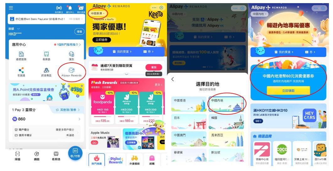 4. 乘車優惠 交通方面,AlipayHK內提供的服務更涵蓋內地公共交通乘車碼包括深圳地鐵,及當地call車服務,切合用戶不同用車需求,輕鬆暢遊深圳無難度!透過 AlipayHK App 內小程式“跨境Call車”於內地call車兼付車資,首次使用即享港幣10元優惠。 領取方法:進入AlipayHK主頁,點擊“Alipay+ Rewards”,目的地選擇“中國內地”進入專頁領取優惠券。