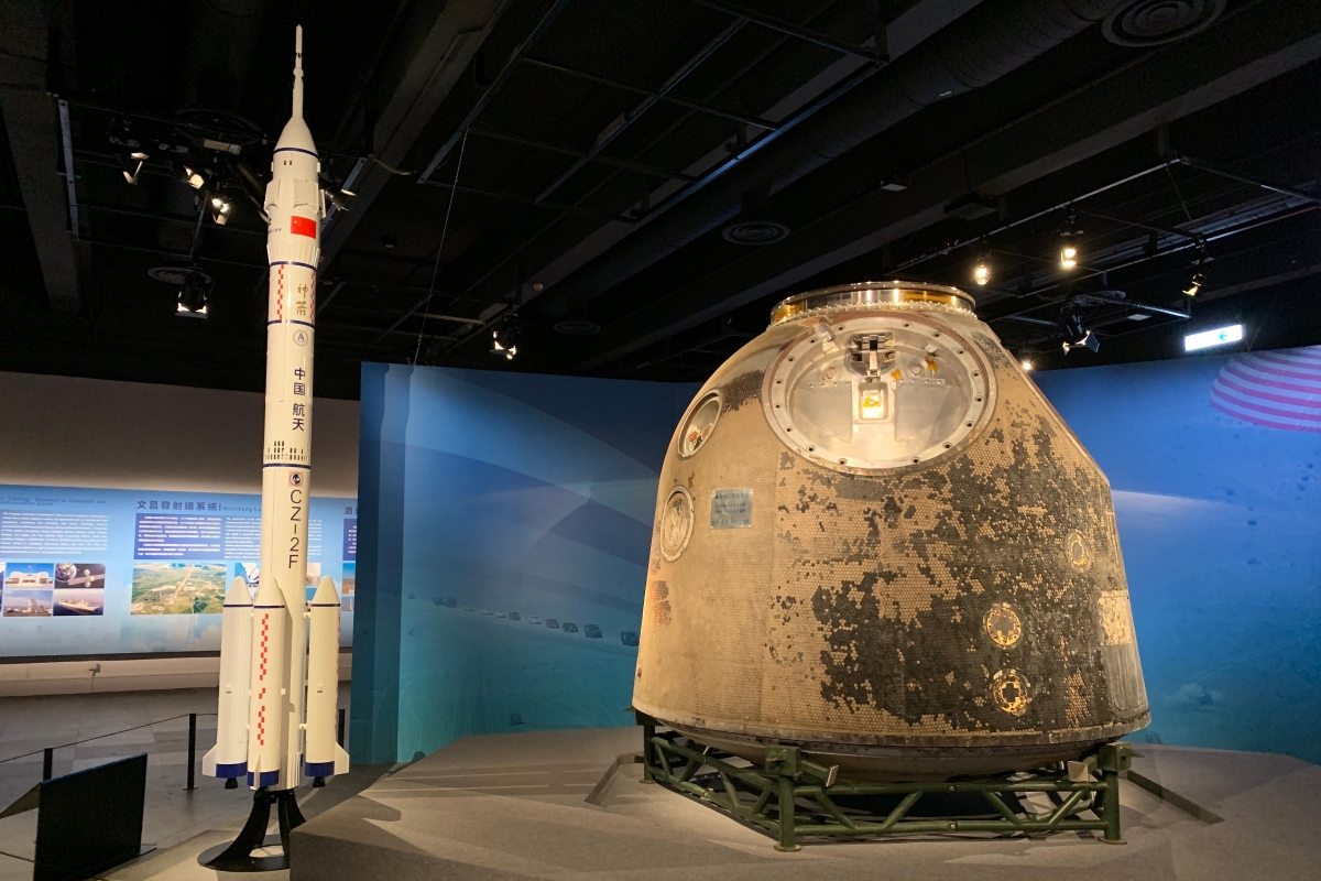 神舟十三號載人飛船返回艙及長征二號F運載火箭1:15的模型。