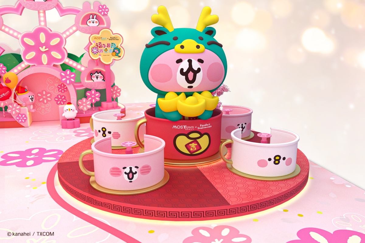 “運氣最強轉轉杯”。 “MOSTown新港城中心 x Kanahei’s Small animals福氣最‘龍’遊樂園”將集合5大新春最旺打卡區及2大開運主題玩樂區,除了P助與粉紅兔兔,更有Kanahei’s Small animals的一群萌萌小動物及朋友:小女孩、粉紅小動物、藍色小動物及敬語兔兔等在樂園各處迎接大家。 3.2米高的龍年造型粉紅兔兔已手捧滿滿的金元寶,化身成超萌吉祥物,在“運氣最強轉轉杯”恭候大家,預祝大家龍年金銀滿屋、福氣常滿!下一站來到全港首個5米高“桃花最旺摩天輪”,紅粉緋緋的桃花摩天輪聳立在福氣最“龍”遊樂園中間,是龍年必到打卡之處!“桃花最旺摩天輪”另一邊則特設“龍年最FUN打卡牆”,P助與粉紅兔兔已換上春遊造型帶領大家展開龍年開運郊遊團,留下珍貴美好的回憶。