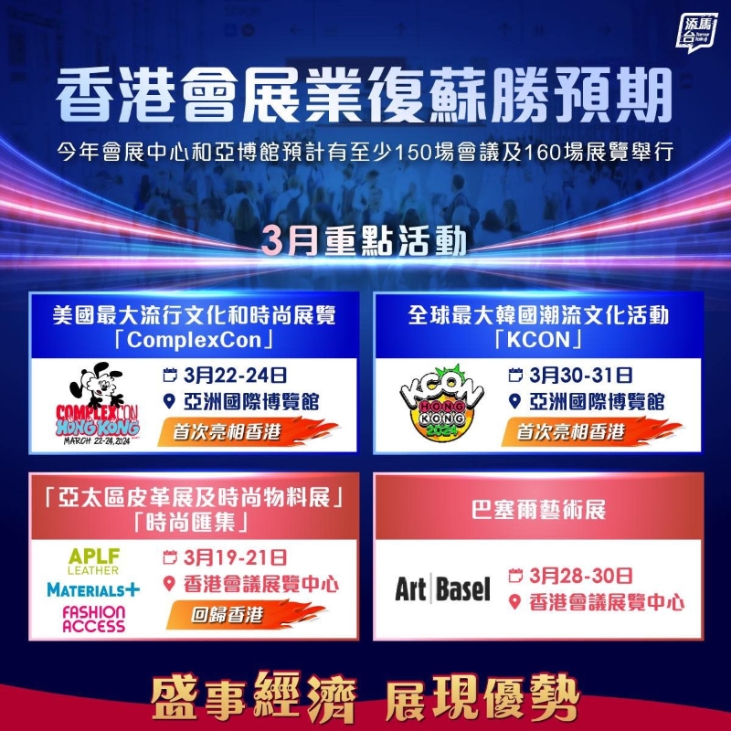 (圖片:添馬台Facebook) 疫情期間轉到其他城市舉行的展覽回歸,亦有多個展覽和流行文化活動將首次亮相,如全球最大的韓國潮流文化活動“KCON”、美國最大的流行文化和時尚展覽“ComplexCon”,以及航運和空運界盛事“Super Terminal Expo”。 此外,“亞太區皮革展及時尚物料展”及“時尚匯集”這兩個時尚界大型採購平台,下月亦會由阿聯酋迪拜回歸香港,而去年移師新加坡舉行的“Vinexpo Asia”酒展,則會在5月回歸香港。主辦方選擇在香港舉行展覽和活動,反映香港會展業優勢。 (完) 【編輯:黃璇】