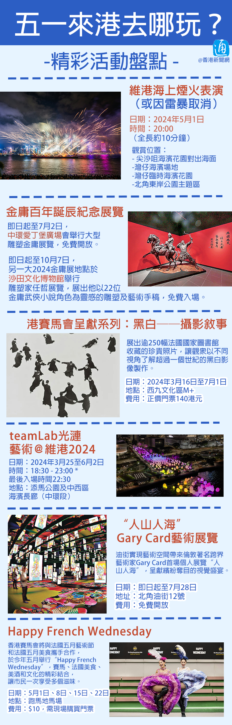 香港新聞網5月1日電 五一勞動節假期來臨,香港舉辦不少活動迎接各地遊客,例如維港海上煙火表演、M+博物館首個攝影主題特別展覽等,戳圖了解!