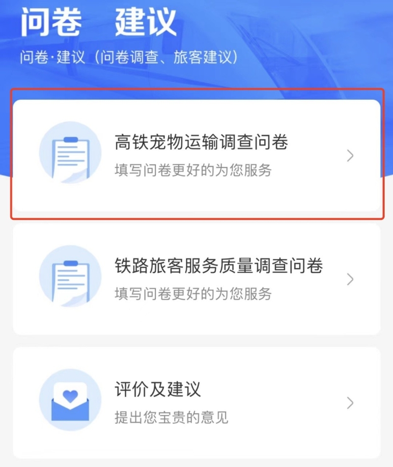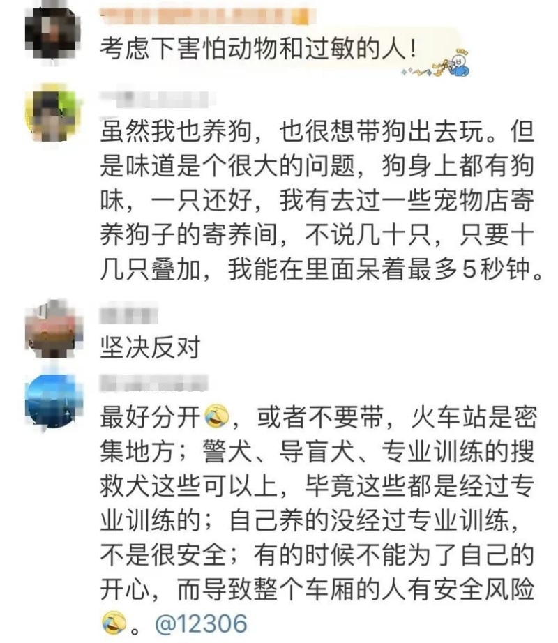 中國鐵路客戶服務中心推出《鐵路旅客高鐵寵物運輸調查問卷》。 網民對此熱烈討論,寵物能否上高鐵的話題,不少喜愛小動物的人表示支持,認為能和寵物一起坐高鐵或者開通寵物列車,是一種很人性化的做法。有旅客接受央視記者採訪時表示:“我覺得還是可以,因為現在很多人,家裡養貓養狗,他想出行他就覺得家裡有貓有狗限制他出行了,等於沒人看呀,放在家裡也不放心。”